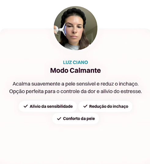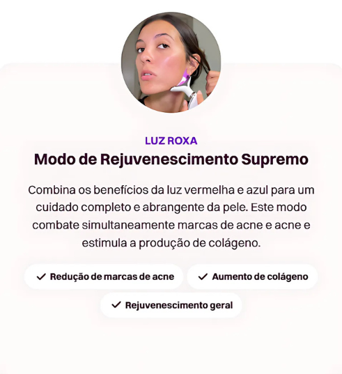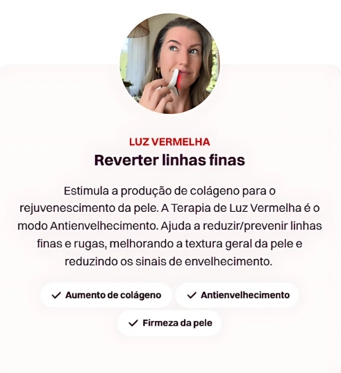 Nosso dispositivo vem equipado com 7 opções diferentes de terapia de luz LED que foram cientificamente comprovadas para melhorar a textura da pele, reduzir rugas, combater acne e muito mais!